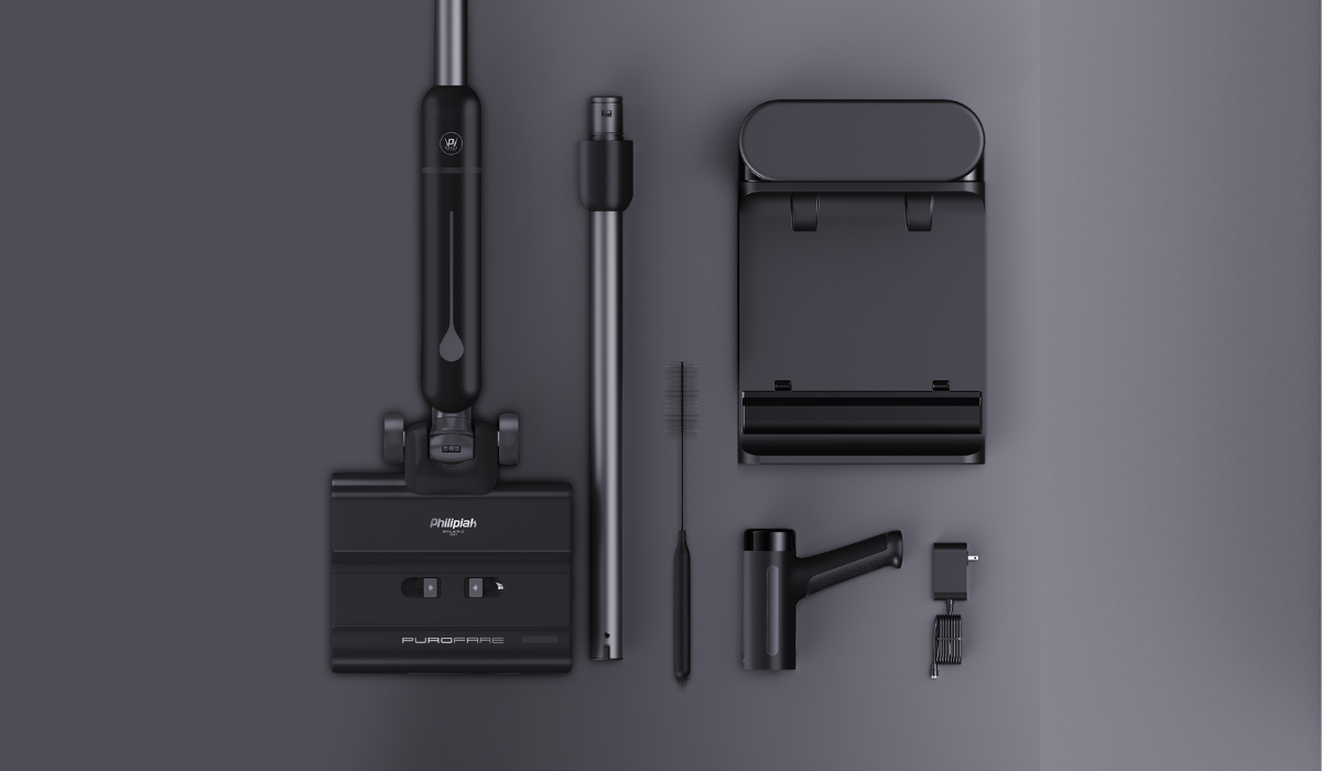 The Philipiak Purofare base consists of a stand and a container to hold the replacement rollers and cleaning brush. It ensures that the device remains clean and stable after cleaning.